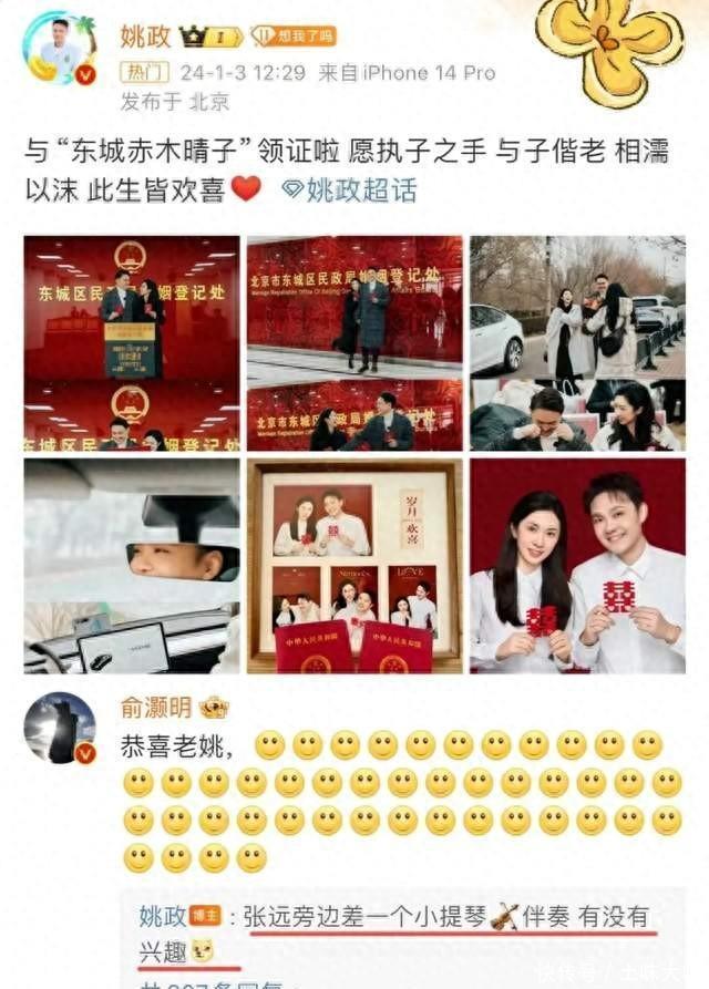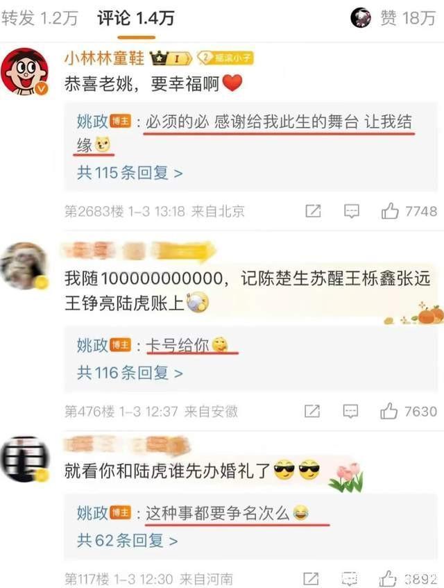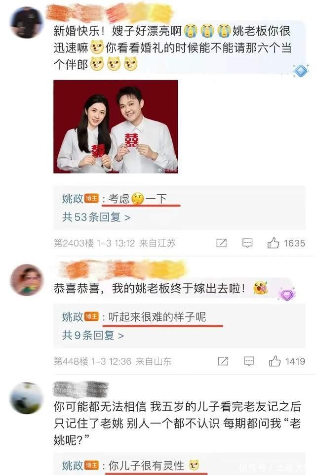 老姚领证,0713的昆仲们皆刷刷的来互动,恭喜老姚终于嫁出去了!小鹿竟然笑喷在网友挑剔区!